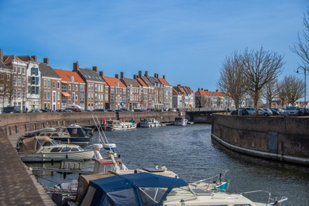 Canal Houses and Houseboats in Traditional Dutch Seaside Town Vlissingen, Zeeland, Netherlands