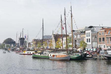 Canal (canal) at the Old Harbor and Galgewater with traditional houses and boats in Leiden, The Netherlands on a cloudy autumn day with trees and boats