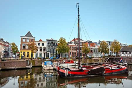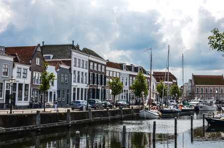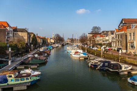 Dordrecht, Netherlands - 11 March 2016: View of the buildings along the canal in city and municipality in the Western Netherlands. Boats moored at the coast.