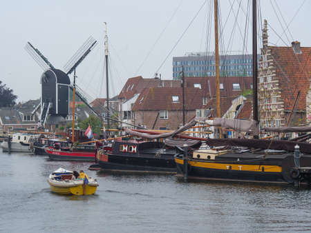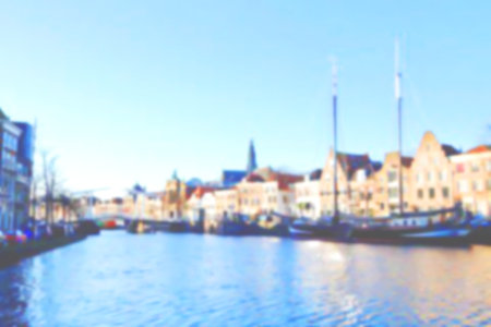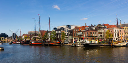 Haarlem, Netherlands - August 3, 2016: Picturesque cityscape with beautiful traditional houses and vessels in canal of Haarlem