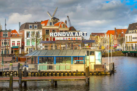 Leiden, Netherlands harbour at canal and windmill