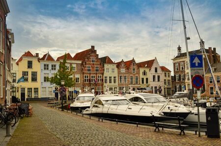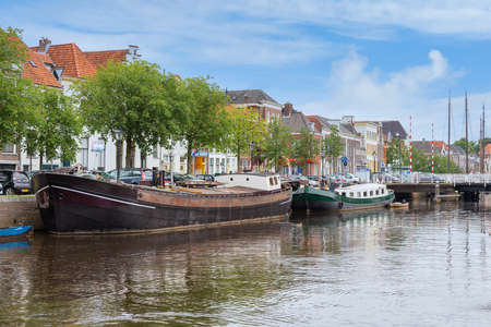 Cityscape with houseboats at Londensekaai in Middelburg. Province of Zeeland in the Netherlands
