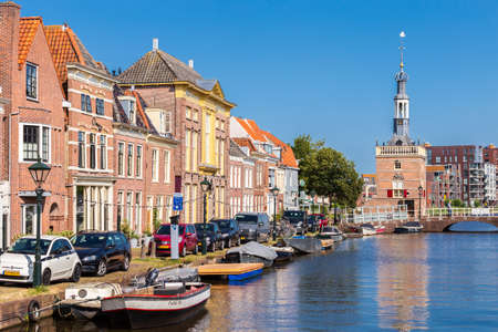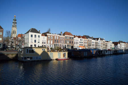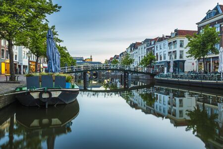 Cityscape of Leiden, the Netherlands. View of New Rhine river and Dutch houses.