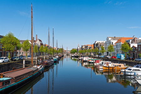 Middelburg, Netherlands 21 March 2025, Canal with moored boats and a row of historic houses in Middelburg, Netherlands, under a clear blue sky.