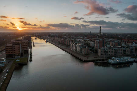 The center of Schiedam with beautiful narrow streets and small canals, photo tasks in the evening hours with beautiful orange and blue clouds. South Holland Province