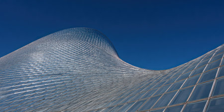 A modern architectural marvel of a glass facade against a clear, azure sky