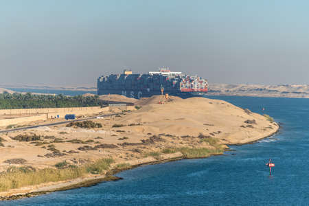 Suez, Egypt - November 5, 2017: Large container vessels (ship) passing Suez Canal in the sandy haze in Egypt.