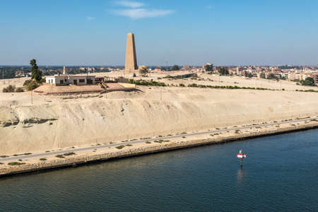 Ismailia, Egypt - November 5, 2017: Military built and telecommunication tower on the shore of the Suez Canal near Ismailia, Egypt, Africa. Suez Canal Defence Monument in the background.