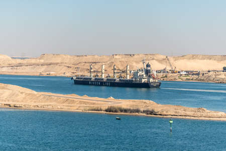 Ismailia, Egypt - November 5, 2017: Bulk carrier Bunun Champion vessel passing the New Suez Canal near Ismailia, Egypt, Africa.
