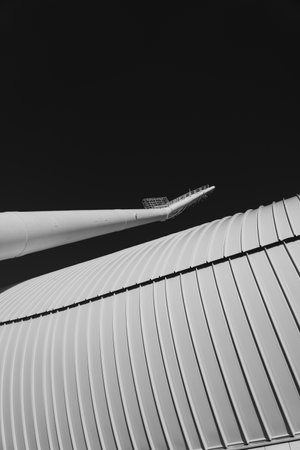 Minimalism, abstraction. A spotlight on the background of the stadium wall. A tall building. Black and white photo