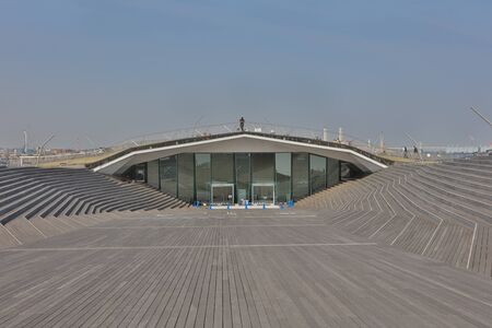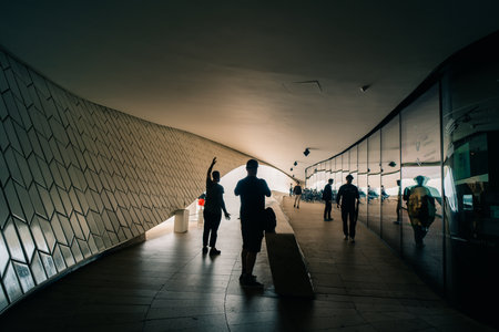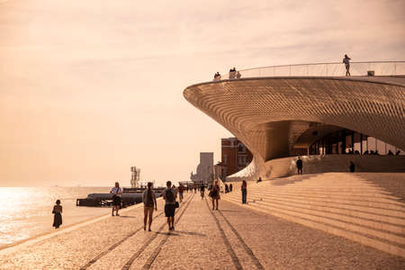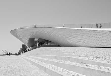 LISBON - JANUARY 4, 2018: Incidental people walking along the stairs and main entrance to the Museum of Art, Architecture and Technology (MAAT) in Lisbon by the River Tagus.