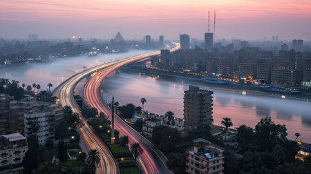 The sun is setting over the city of Cairo, casting a warm glow over the pyramids and the Nile River