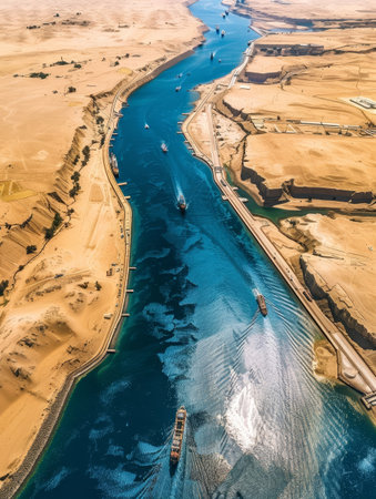 A sweeping aerial view captures the strategic commercial route of a canal, busy with the transit of various cargo ships