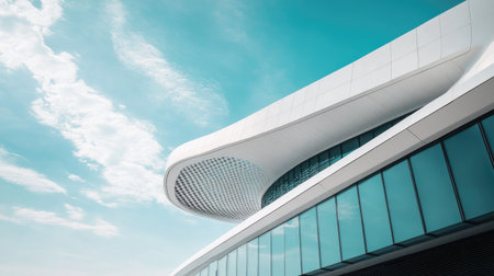 A sleek, modern structure showcases elegant curved lines, set against a vibrant blue sky, highlighting minimalist architecture and innovative design elements.