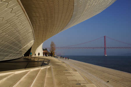 LISBON, PORTUGAL - FEBRUARY 12, 2019: People walk near famous MAAT Museum in Lisbon near river Tagus and Landmark 25 of April bridge.