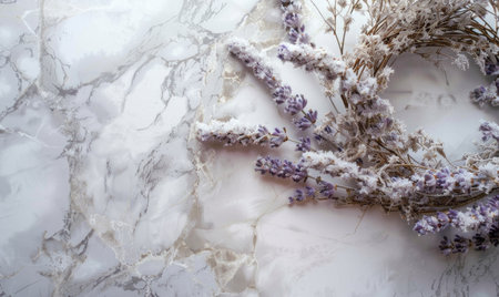 Delicate lavender flower wreath on marble background