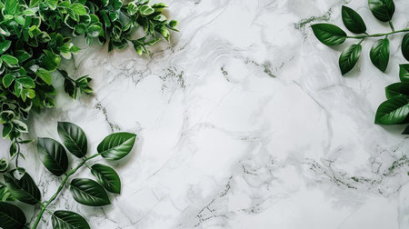 A flat lay image featuring green leaves arranged on a white marble surface.