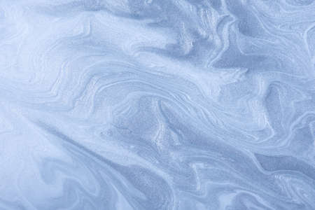 Abstract fluid art background light blue colors. Liquid marble. Acrylic painting on canvas with denim shiny gradient. Alcohol ink backdrop with pearl wavy pattern.