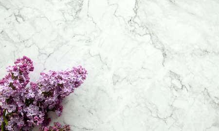 Spring flowers. Lilac flowers on white stone background. Top view, flat lay