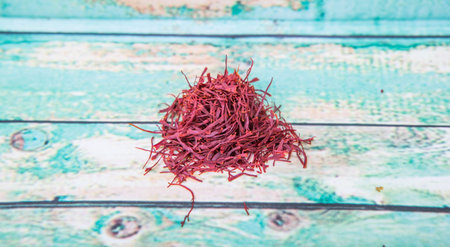 Dried saffron spice over wooden background