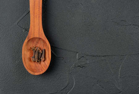Dry cloves in wooden spoon on empty dark background, top view