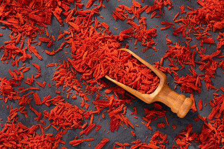 Red thin hot chili threads on a dark background. For decorating Asian dishes