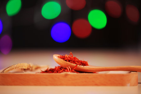 Saffron in a spoon on a dark background, selective focus, macro shot, shallow depth of field