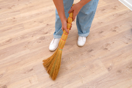 Woman's hands holding broom, sweeping light wooden floor. Housekeeping and cleaning concept. Home chores and domestic maintenance activity for hygiene.