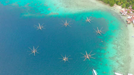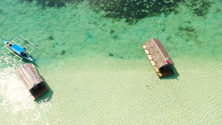 A floating native cottage on a sandbar in the tourist island of Caramoan in the Philippines. Summer and travel vacation concept. A lagoon with floating crotches, top view.