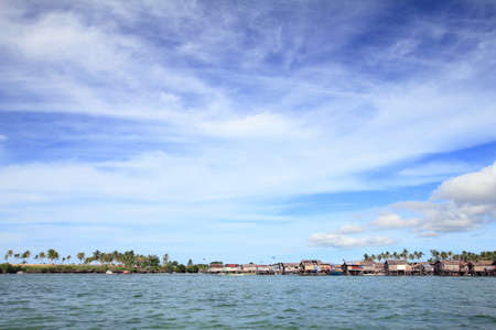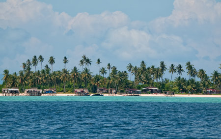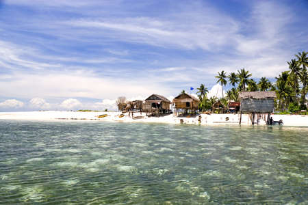 Malaysia. A view of the shore of a reef island with coconut palms and the huts of a sea gypsy village near the town of Semporn on the island of Borneo.