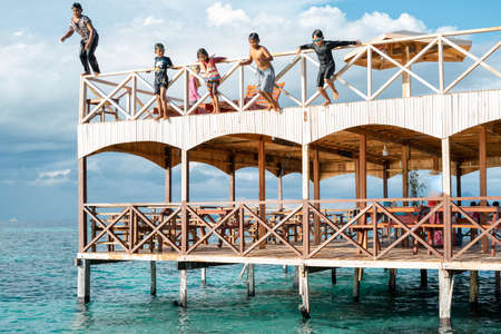 Semporna, Malaysia - November 26, 2019: Kids jumping off from the second floor terrace into the sea. Having fun on a school holiday vacation with friends.