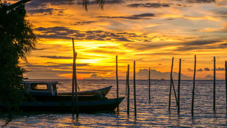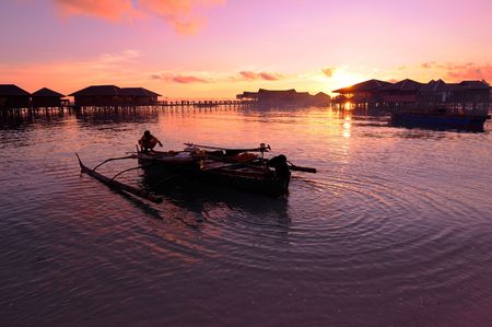 Fisherman prepares his traditional boat during sunset at the coastal of beauty tropical island