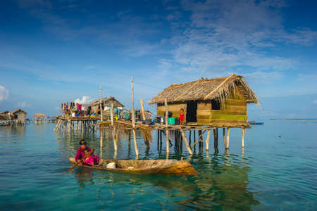 Sabah, Malaysia-July 10, 2016:Daily life of unidentified seagypsy fisherman people in Mabul Island, Malaysia. Seagypsy people is a nomadic and stay in the wooden boat or canoe.