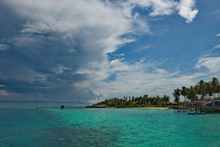 Malaysia. The East coast of the island of Borneo. Palm grove on the seashore of the coral island of Mabul, famous for its diving clubs.