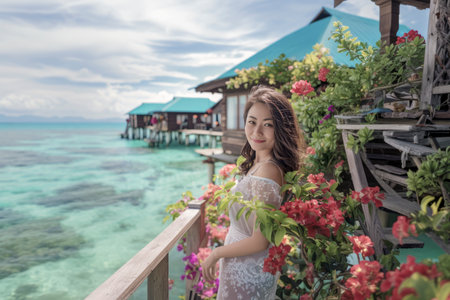 Smiling woman in white dress standing on a tropical overwater villa balcony, surrounded by flowers and turquoise sea under a bright sky