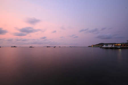 Bamboo bungalows above sea during dark sunrise