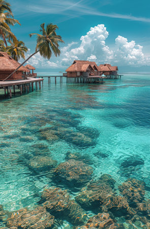 A serene wooden hut on stilts rests beside a tropical jungle, surrounded by palm trees and clear turquoise water. Ideal for themes of escape, isolation, tropical retreats, and natural beauty.