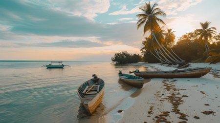 Semporna. Malaysia. December 03, 2018. In the early warm morning, moored on the sandy beach, pleasure boats await the many tourists who come to the island of Mobul for diving.
