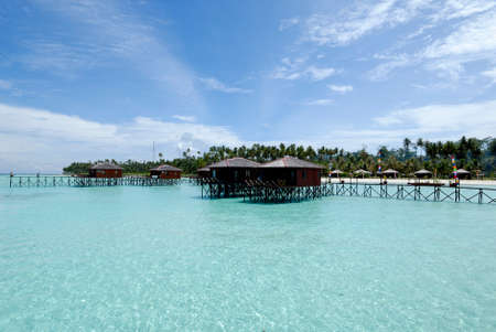 beautiful floating chalet at mabul island aand blue sky.
