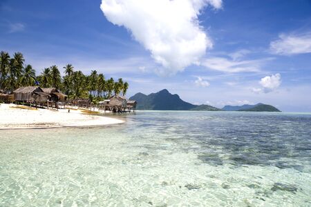 Image of a remote Malaysian tropical island with deep blue skies, crystal clear waters, atap huts and coconut trees.