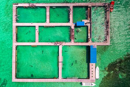 Dolphins, sharks, stingray in caribbean sea pool park. Swimming with fish. Aerial view.