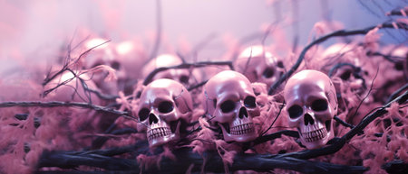 An AI generated illustration of an array of pink skulls on the branches of a tree with pink foliage