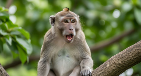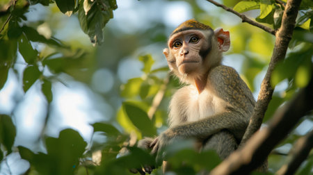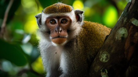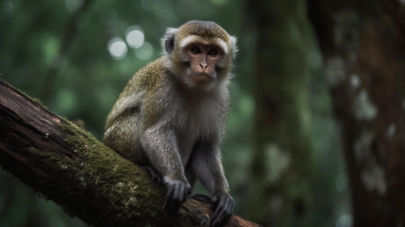 An AI generated illustration of an adorable monkey perched on a tree branch in a lush green forest
