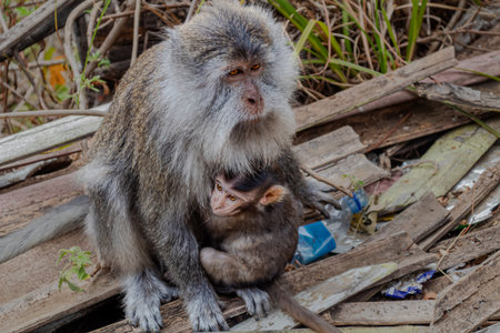 Protective Wild Monkey Embracing Its Infant Sitting Amongst Discarded Debris