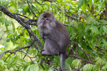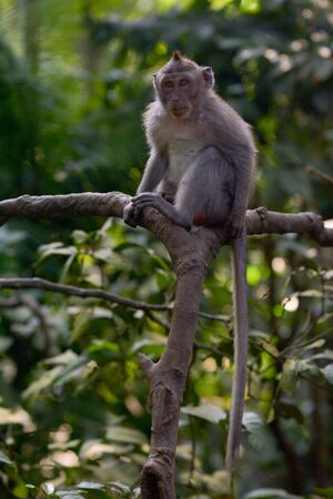 Adult monkey sitting on a tree branch in Ubud Sacred Monkey Forest in Ubud, Bali, Indonesia. Living on the tree of the macaque monkey. Macaca fascicularis.