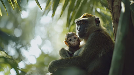 A heartwarming scene captures a mother monkey lovingly holding her baby in a lush tropical jungle, showcasing the bond of affection in wildlife.