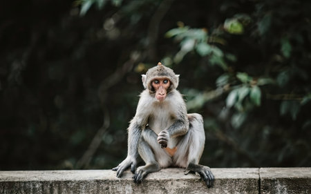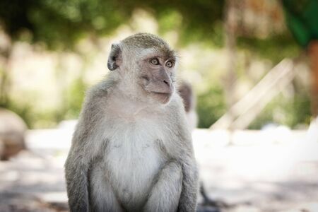 cute thailand macaque with bright eyes sits with folded legs on a blurred tropical background