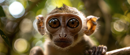 A young monkey with large, inquisitive eyes stares directly at the camera, its fur a soft brown against the vibrant green backdrop of the forest. The monkey's expression is both curious and slightly apprehensive, suggesting a playful interaction with the viewer.