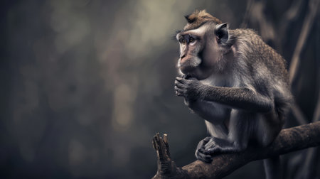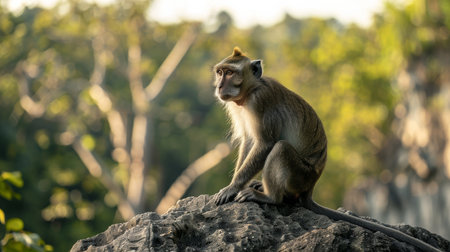 Long-tailed Macaque Perched in Lush Tree, Observing in Natural Light with Copy Space, Promoting Wildlife Conservation and Awareness of Biodiversity