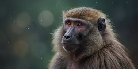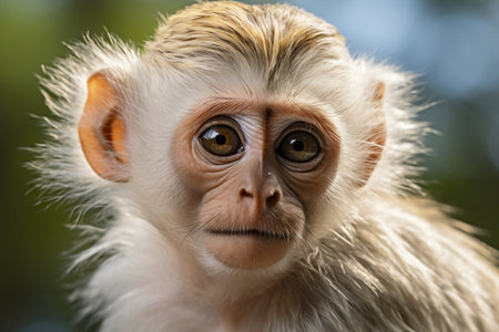 A close-up view of a monkey's face with a blurry background. This image can be used to depict wildlife, nature, or animal behavior.